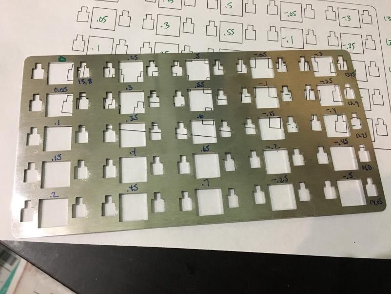 The hold up on this project at the moment is that I need to figure out the best placement of Choc stabilizer cutouts. Kailh’s datasheets about the stabilizers don’t have any indication of what the cutouts should be, so while I have the cutout shapes correct, I don’t have the best positioning of the cutouts yet with respect to the switch. You can see here that I’ve had a test plate made with various positions to figure that out, but I haven’t taken the time to use it yet.
