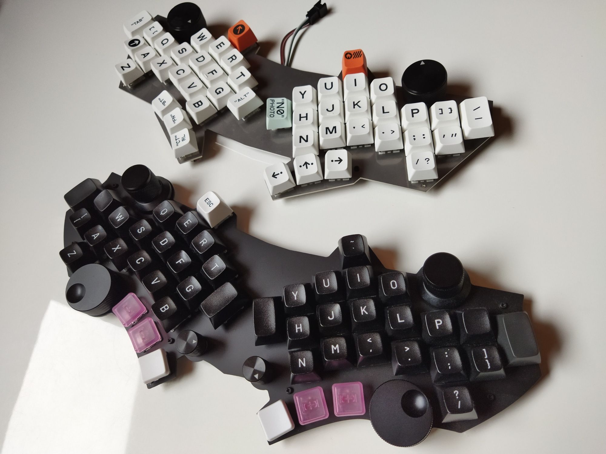 After ordering everything from AliExpress (we are in 2018!), which took a month to arrive, I had plenty of time to design the physical layout and try a couple of cardboard mockups. The result: two budget prototypes for $40 each. I consider these my first mechanical keyboards because I used one of the cardboard ones for almost a year as my daily driver at home. :D