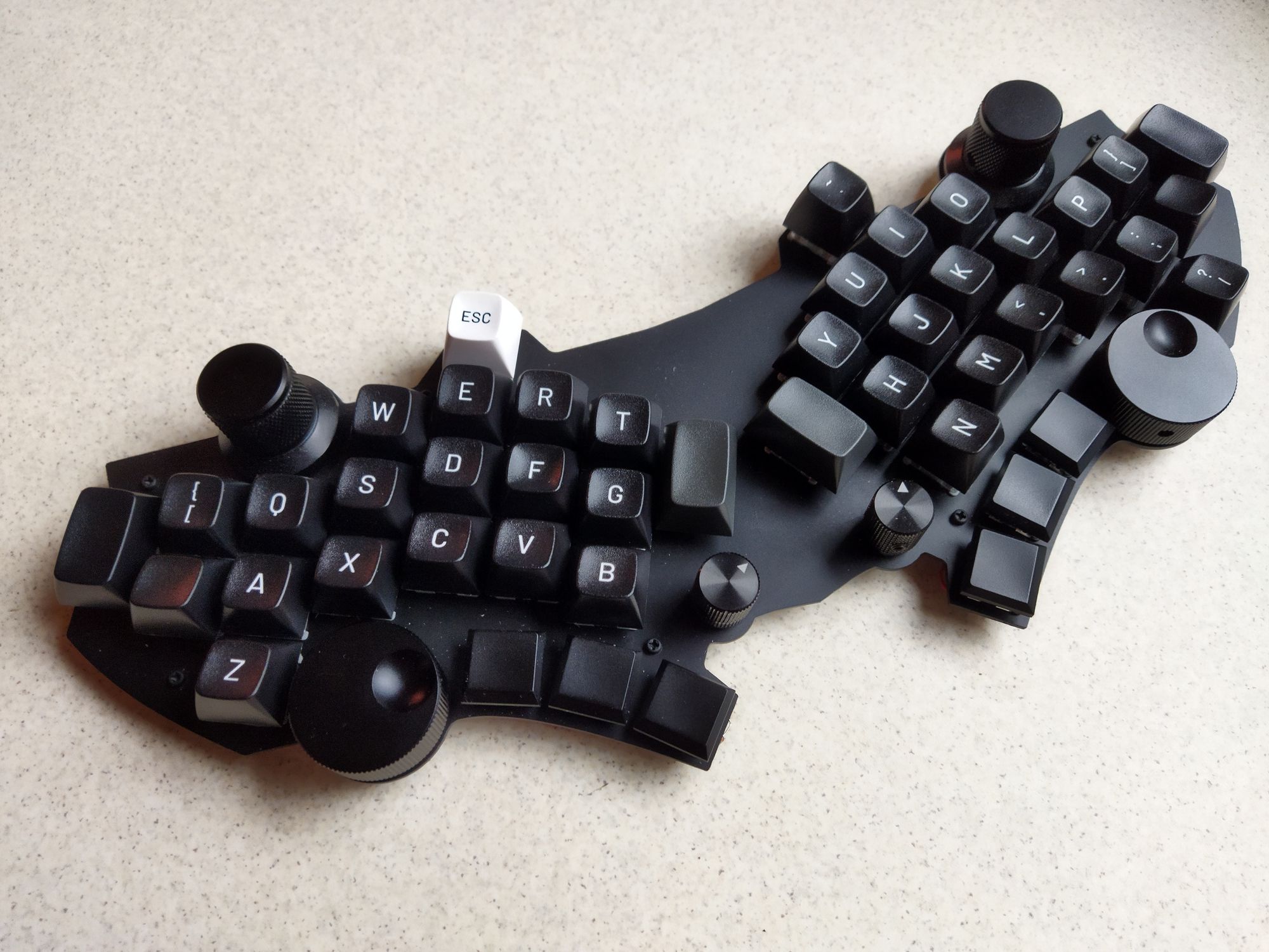 Keycaps: Since my designs have flat plates, I prefer sculpted caps. If I’d be into 3D printing and keywells I’d probably use low-pro uniform caps. I have a gorgeous MBK Myth Cherokee set, but I also like CFX and can’t wait for the convex POM MBK caps for the thumb keys.