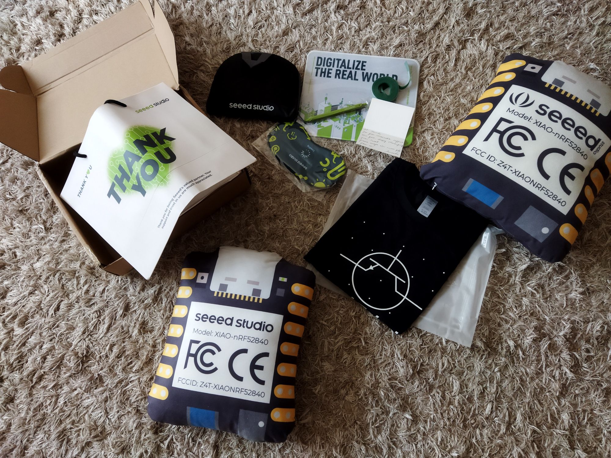 I don’t really buy stuff these days, but I won a sticker pack from Don (TheBoard) and there’s one made by one of his kids I guess. That’s cute in the sense you find your kid’s art lovely. And do the Seeed XIAO pillows count as swag? In fact, those are not just nice but also useful. Other than that, I use a Keebio coaster in my office. 😀