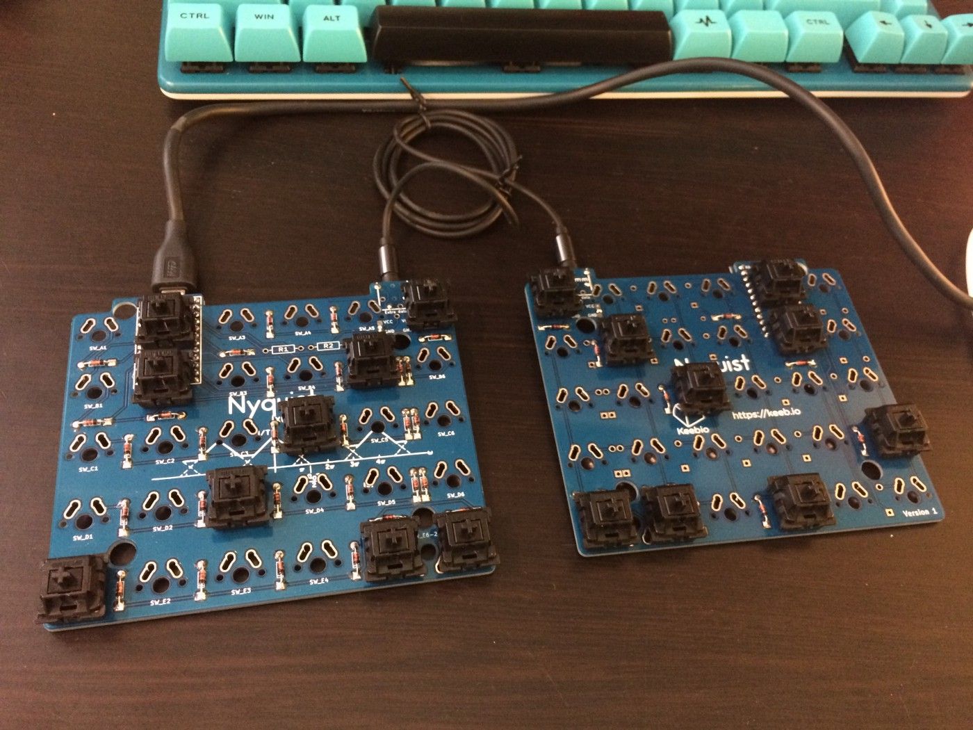 Combining that guide with the open-source PCB design for the Let’s Split, I hacked away at designing Nyquist Version 1 for about 3 days. Once I was finished, I generated the Gerber files in KiCAD and fired them off to EasyEDA for fabrication of 30 PCBs.