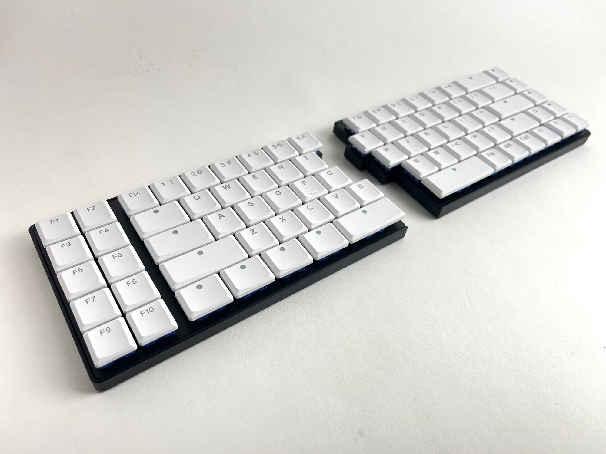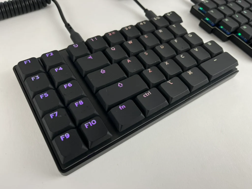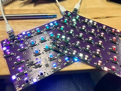 For the original run of FoldKB Rev. 2 PCBs, the Backslash key was accidentally made to be 1u, instead of 1.5u. This has been corrected with the Rev. 2.1 PCBs. While at it, underglow RGB LEDs were added onto each half per the request of the FoldKB's biggest fan.