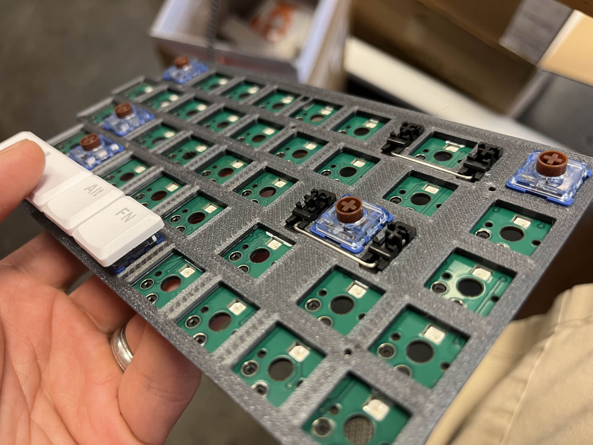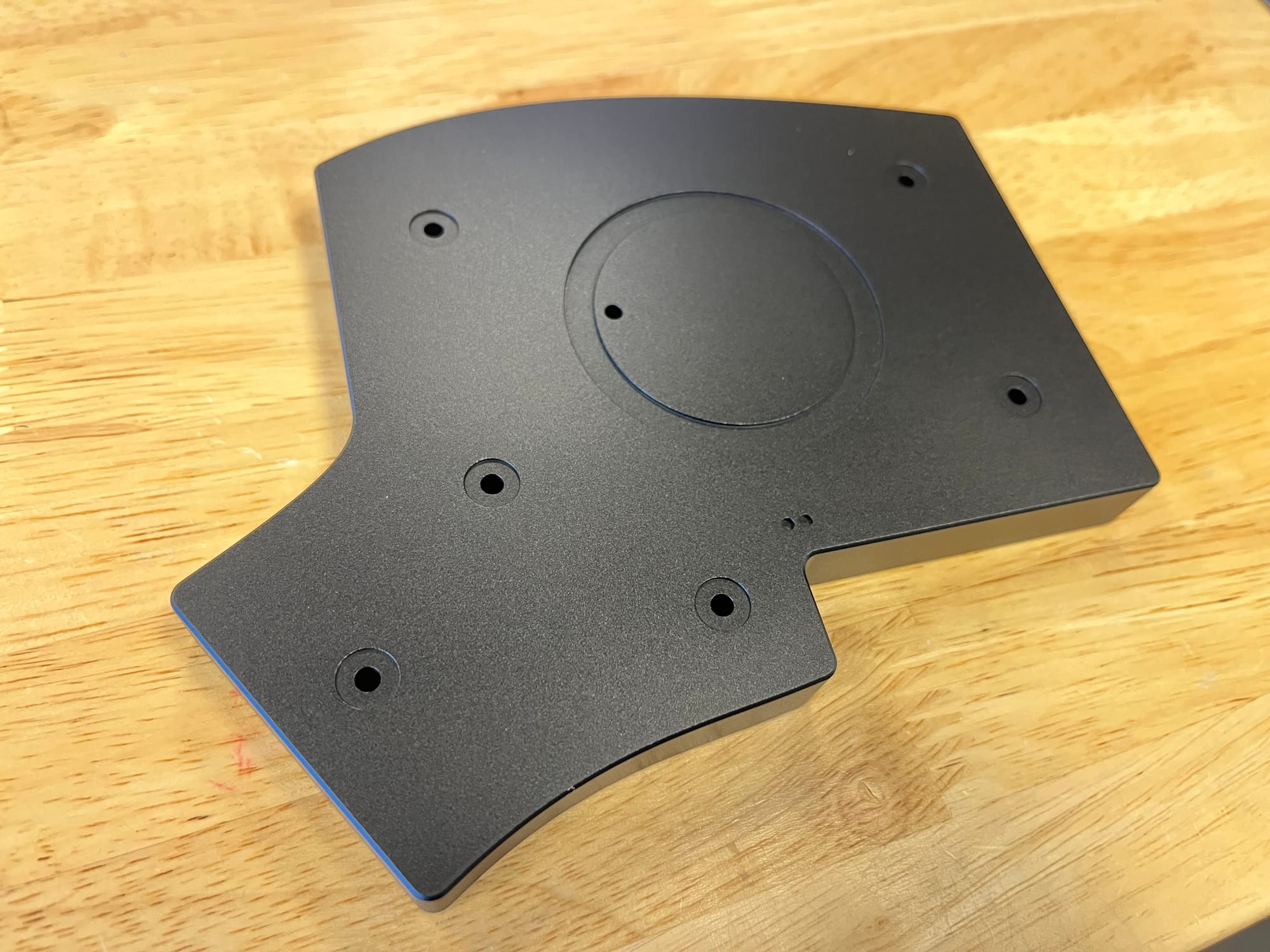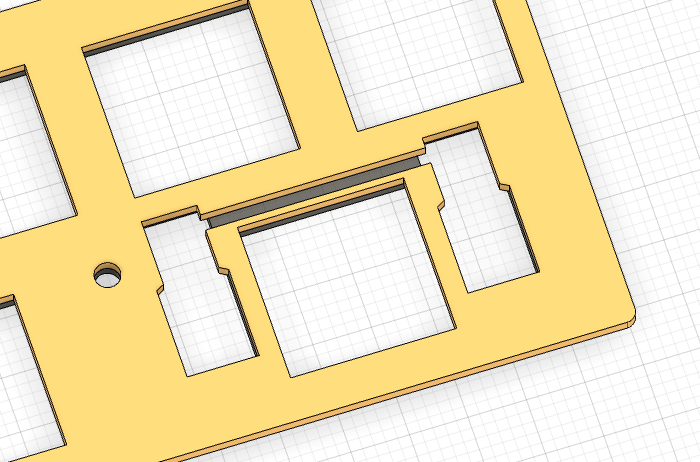 So, we had to switch to using Kailh Choc V2 stabilizers, and while the PCBs cutouts for the stabilizers could be kept as is, revised designs for the plates had to be done to allow the Choc V2 stabilizers to sit in there properly (they are plate-mounted stabilizers). Also, because of the positioning of the wire and the plate needing a cutout for that, a couple of mounting holes had to be relocated on the plate and on the PCB. This also required modification to the aluminum tray, silicone tray liners, and switch plate support foam.